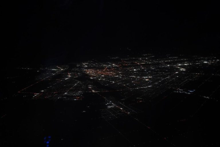 旭川空港から離陸。JALは夜間の離着時に照明を落としてくれるので、映り込みが少なく撮りやすいのが良い。こうして旭川の市街地を見ていると、明るい所と真っ暗な場所がくっきり。少し市街地から離れると一気に人が居なくなってしまっているのが分かります。
